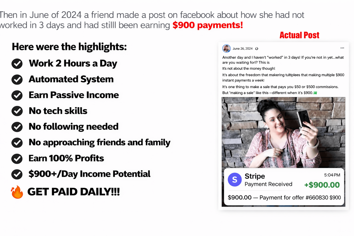 She was talking about earning $900+ a day working just a couple hours, without chasing people, bothering friends and family, or doing all the things I hated about online marketing.